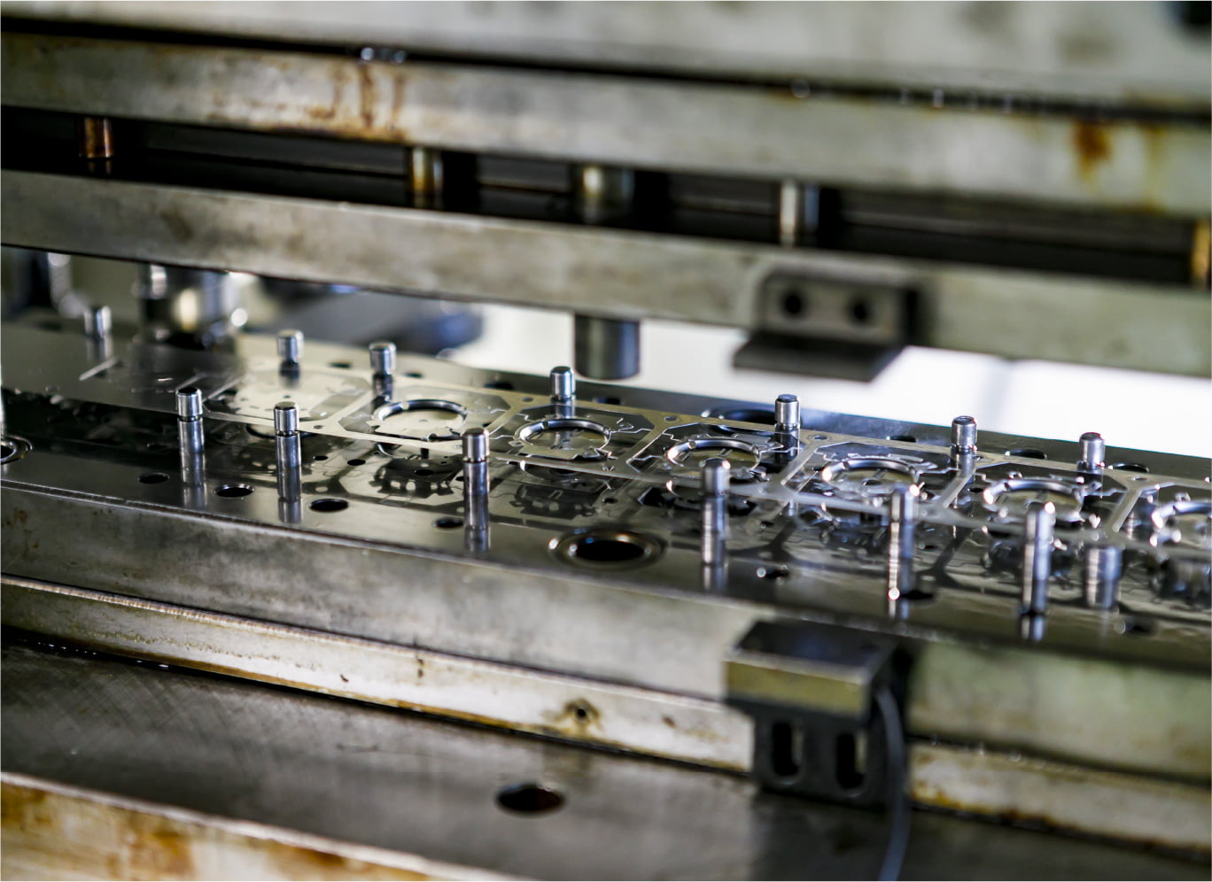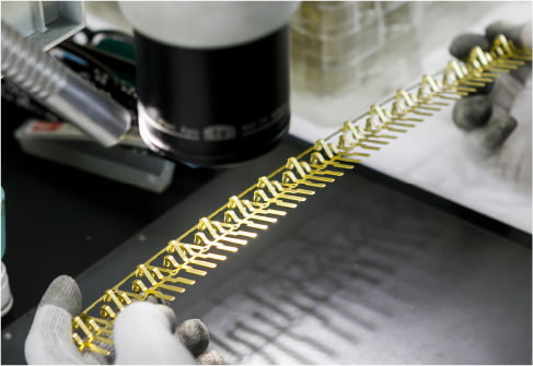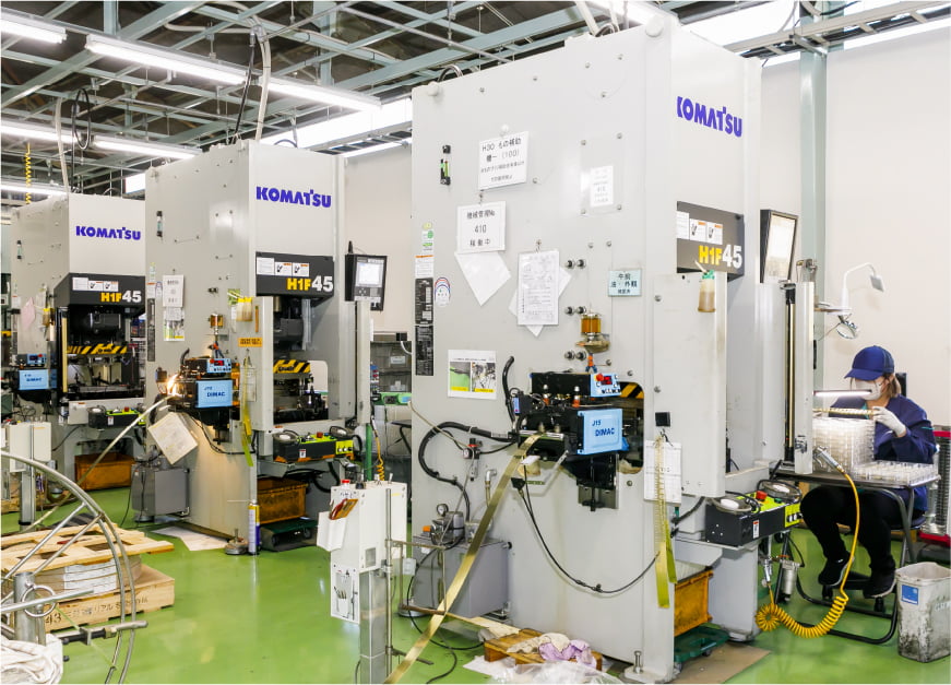 当社では創業以来、プレス金型の設計から製作、および自社金型を使用した金属部品のプレス加工を行ってます。加工材料は薄物が中心で、0.05mm から1.0mmを得意としています。材質はステンレス、銅、黄銅をはじめ洋白、チタン、インコネルなど特殊材料も扱ってきました。中でもステンレス、黄銅は経験値も多く、当社の得意分野です。創業当時、加工製品は単発金型を製作し、カメラ部品を生産していました。1975年に初めて順送金型を製作し、コネクターやスイッチ部品などを手がけ、現在は車載部品や時計部品を中心に製造しています。