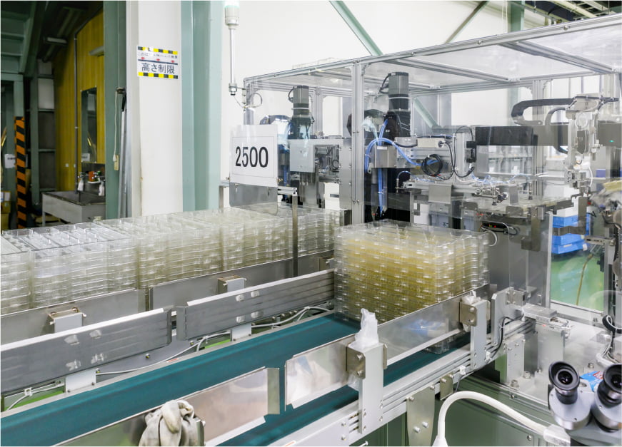 短冊シート状に搬出される製品の、長さが適正かをチェック→専用トレイに収納→搬出用コンベアが出荷状態になるまでの全工程を自動化しました。